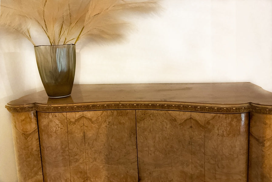 Discover timeless elegance: If you’re looking for one-of-a-kind then look no further! This French inspired cabinet has been my own personal drinks cabinet for many years. Purchased from a grand London home, this is truly a magnificent and elegant masterpiece (please read re delivery and design) Featuring claw feet and grand detailing, with an exception large interior. Two thick, safety glass shelves are screw mounted offering plenty of storage space. The pull out service tray mirror was broken and the base is currently empty (please see picture) As part of the redesign of the piece, intention is to create a faux marble painted base, together with a resin topping, as replacement of the mirror post build isn’t possible due to the exceptional craftsmanship to get to the base efficiently that can’t be taken apart. The rest of the interior section is stunning, and requires no refurbishment aside of minor polishing (interior work other than stated is not included) DESIGN Importantly, the exterior of the cabinet unfortunately has extensive sun damage from its position in its old home. This has created deep breaks and cracks in the veneer which means this is NOT suitable for a restored finish, as damage is too extensive and far gone. The exterior of the cabinet will require a bespoke customisation to create a one off show-stopper. Perhaps a masters painting decoupage, chinoiserie styling. Creation ideas will be discussed and drawn out (most murals would be inclusive in pricing, some designer wallpaper, fabrics or carat gold leaf would be charged in addition at cost price). Photoshop design mock up images featuring up to 3 designs are provided during our design process. DELIVERY LEAD times are between 6/8 weeks and estimate to now be early 2025 for design (unless materials on order have a delay). Delivery is ground floor only. Due to the weight of this cabinet (takes 3 to lift) delivery to upper or lower floors, or up any stairs (other than a couple at threshold) is not possible. Delivery is UK only sorry and will be by us in person. Condition report: Currently in original vintage condition, the locks requirement refurbishment and will be sent away for restoration. The pale walnut, sycamore has deep cracks throughout the front and sides. The restoration of this piece is therefore not possible due to extensive historic damage. The front and sides will require a bespoke decoupage finish.